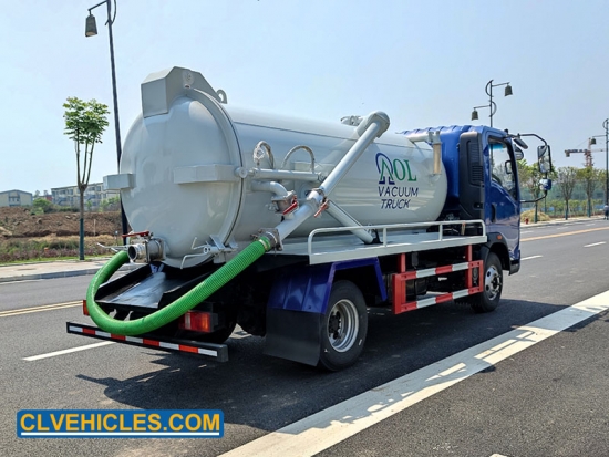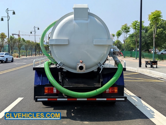 2, The suction truck is equipped with a level inspection window and a self-flowing port, a hand washing device, an anti-overflow valve, a suction pipe of 8 meters, a hydraulic opening of the rear door, and a SK-15 water circulation vacuum pump. The suction truck has a large suction stroke and suction. Besides, the tank has a lifting function.